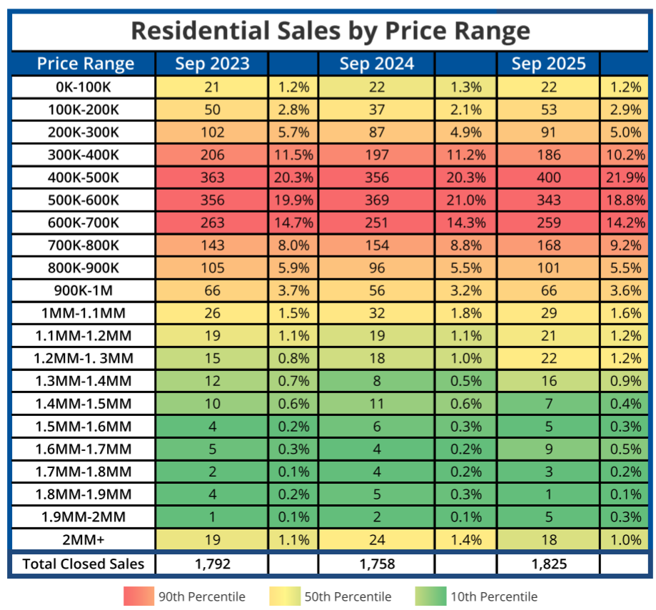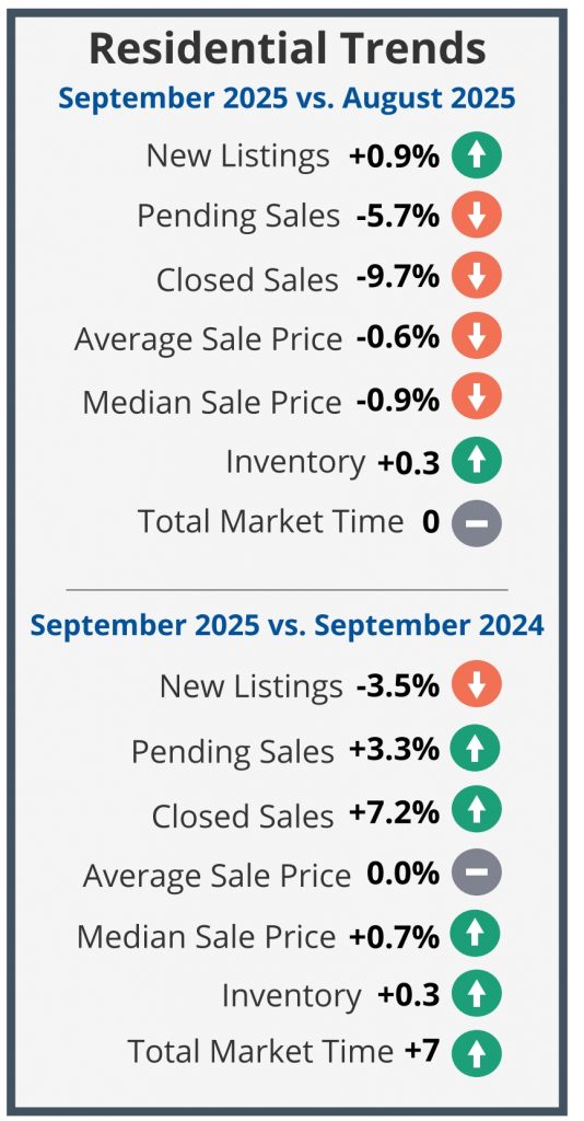- At 1,825 September 2025’s Closed Sales (Solds) are up 7.2% from Sept 2024’s 1,702, and down 9.7% from previous month’s total of 2,021.