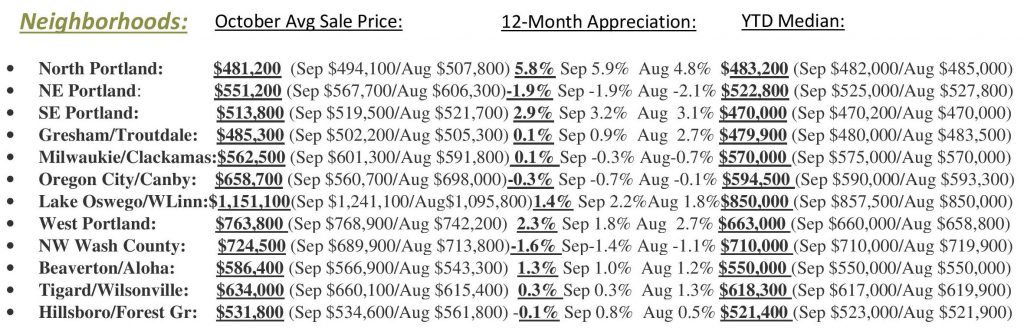 The news is in some of the changes from Sept to Oct this year: Closed sales up 13.2%, and Average Sale Price down $10,900. Inventory dipped just a bit but it’s staying relatively steady & at least up some from last year. N, NE, SE and Gresham area as well as Hillsboro area are all on a steady 3-month trajectory downward in price. ***I tell people every year at this time that it can be the best time of year to buy a home due to prices and the general willingness of people to be more open to negotiating on price or terms with Sellers trying to get things done before the holidays and/or the end of the year.