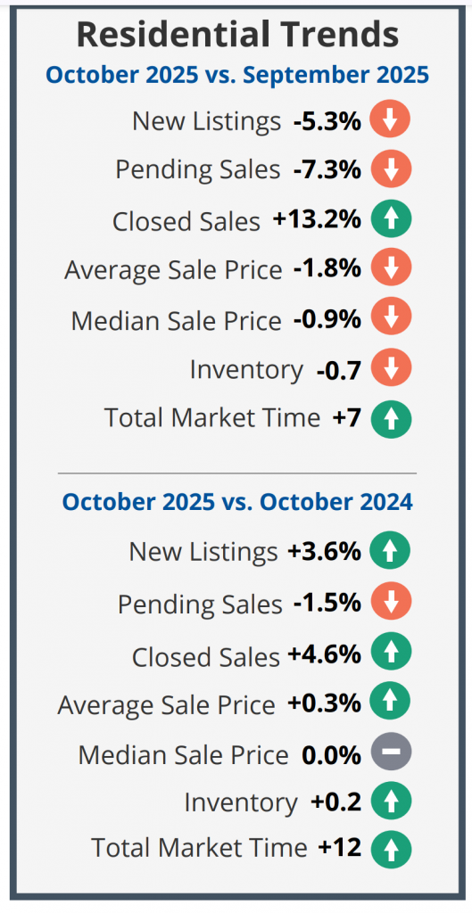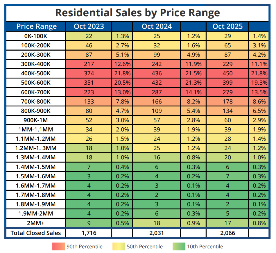 - At 2,066 October 2025’s Closed Sales (Solds) are up 4.6% from Oct 2024’s 1,975, and up 13.2% from the previous month’s total of 1,825.