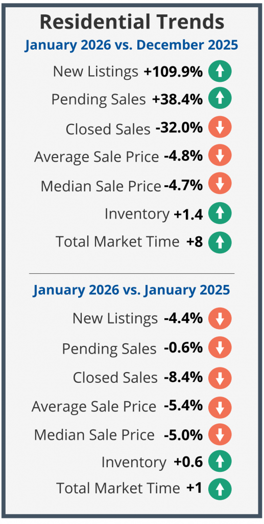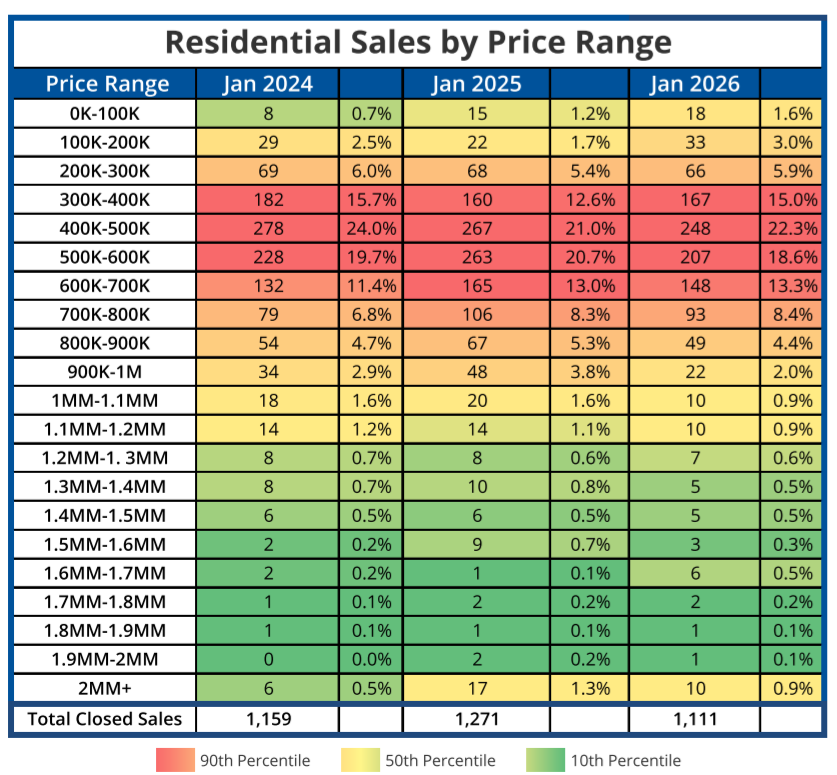 - At 1,111 January 2026’s Closed Sales (Solds) are down 8.4% from Jan 2025’s 1,213, and down 32.0% from the previous month’s total of 1,633.