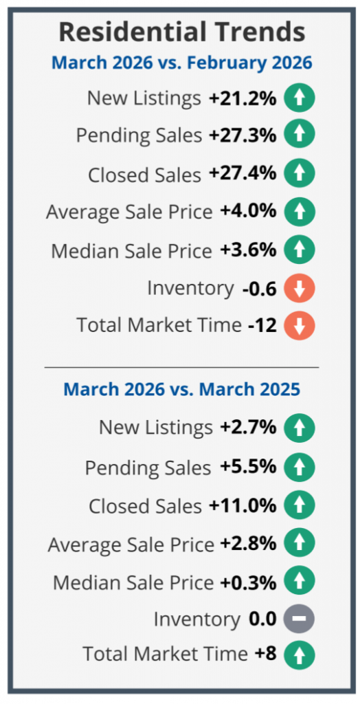 - At 2,319 March’s Pending Sales (Accepted Offers) are up 5.5% from March 2025’s 2,199, and up a whopping 27.3% from the previous month/February’s total of 1,821 Accepted Offers.