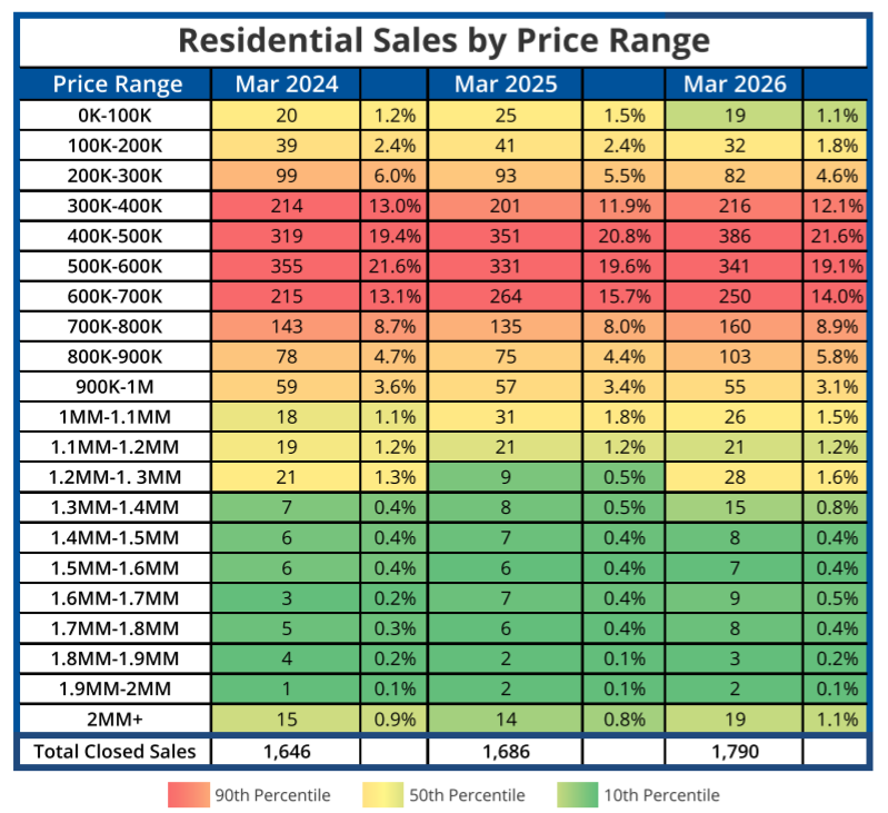 - At 1,790 March 2026’s Closed Sales (Solds) are up 11.0% from March 2025’s 1,613, and increased a substantial 27.4% from the previous month’s total of 1,405.