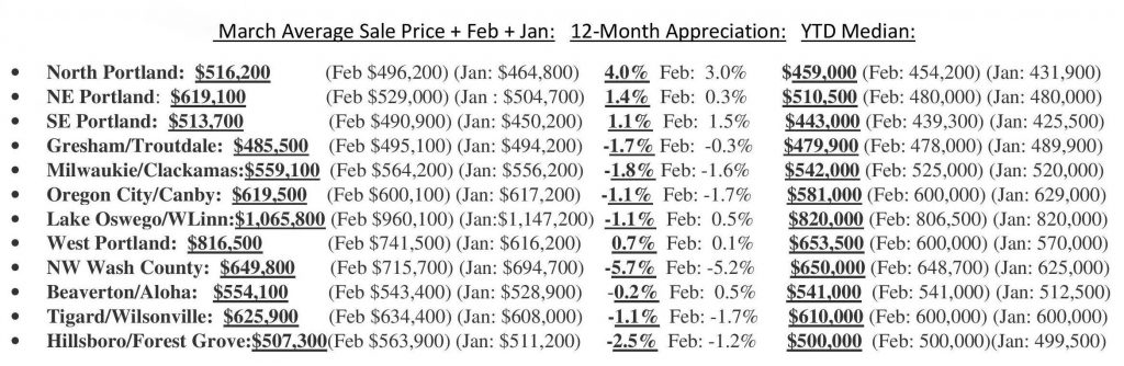 Time on Market decreased from 91 in February to 79 days in March. Activity continued to increase in March with increases in Listings, Pending & Closed Sales. Overall prices rose for the metro even as different parts of town rose and others fell from February (such as Gresham, Milwaukie, NW Washington County & Hillsboro). Interestingly enough, when comparing the first 3 months of 2026 to the same in 2025, Average Sale Price decreased by 1.4% and Median Price decreased by 2.8%. Inventory is at 3.0% right now and Buyers are out in force.